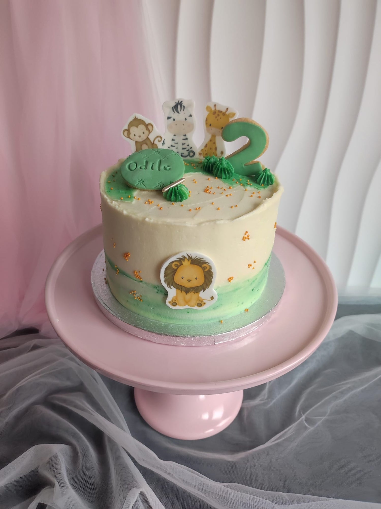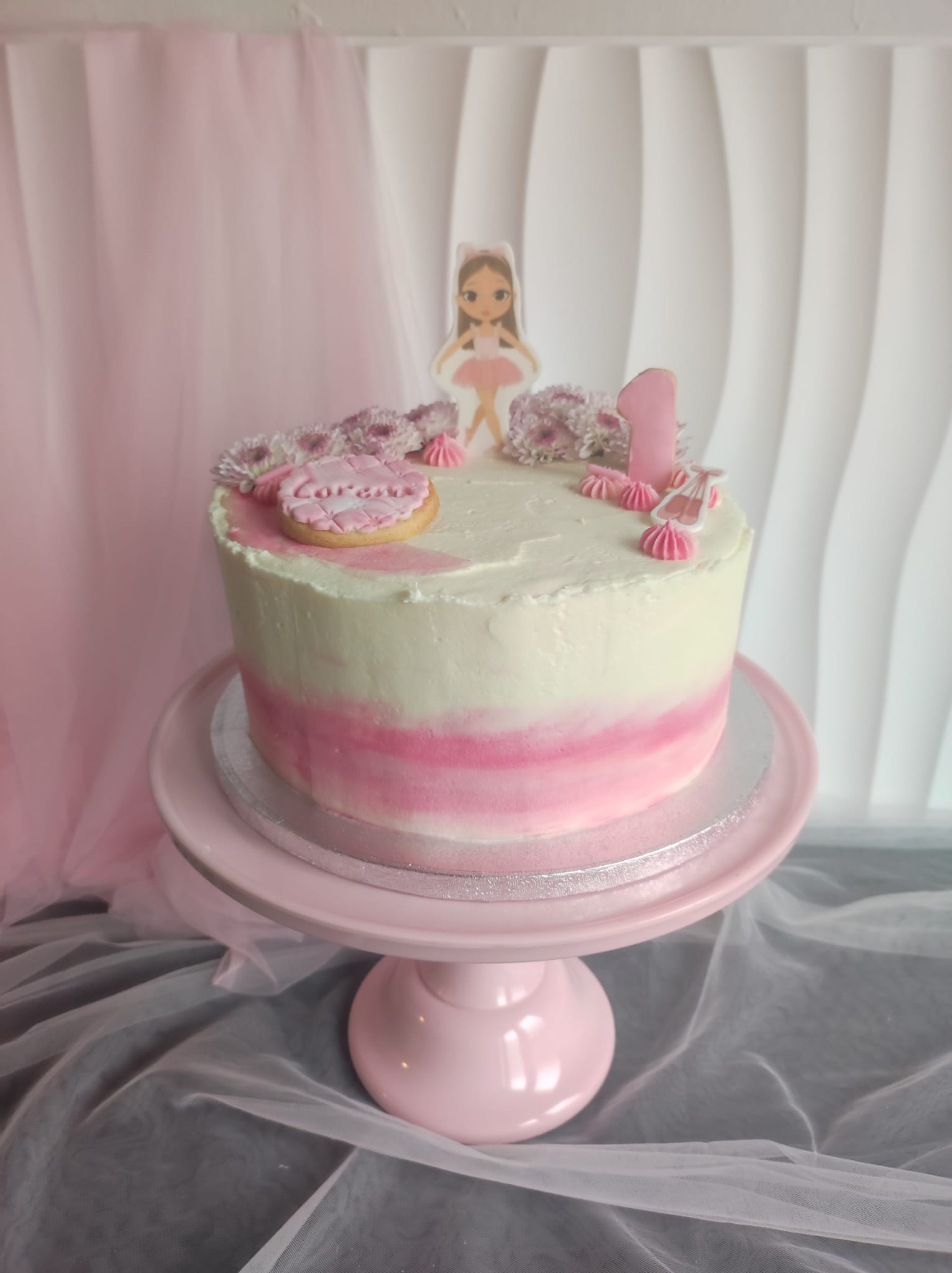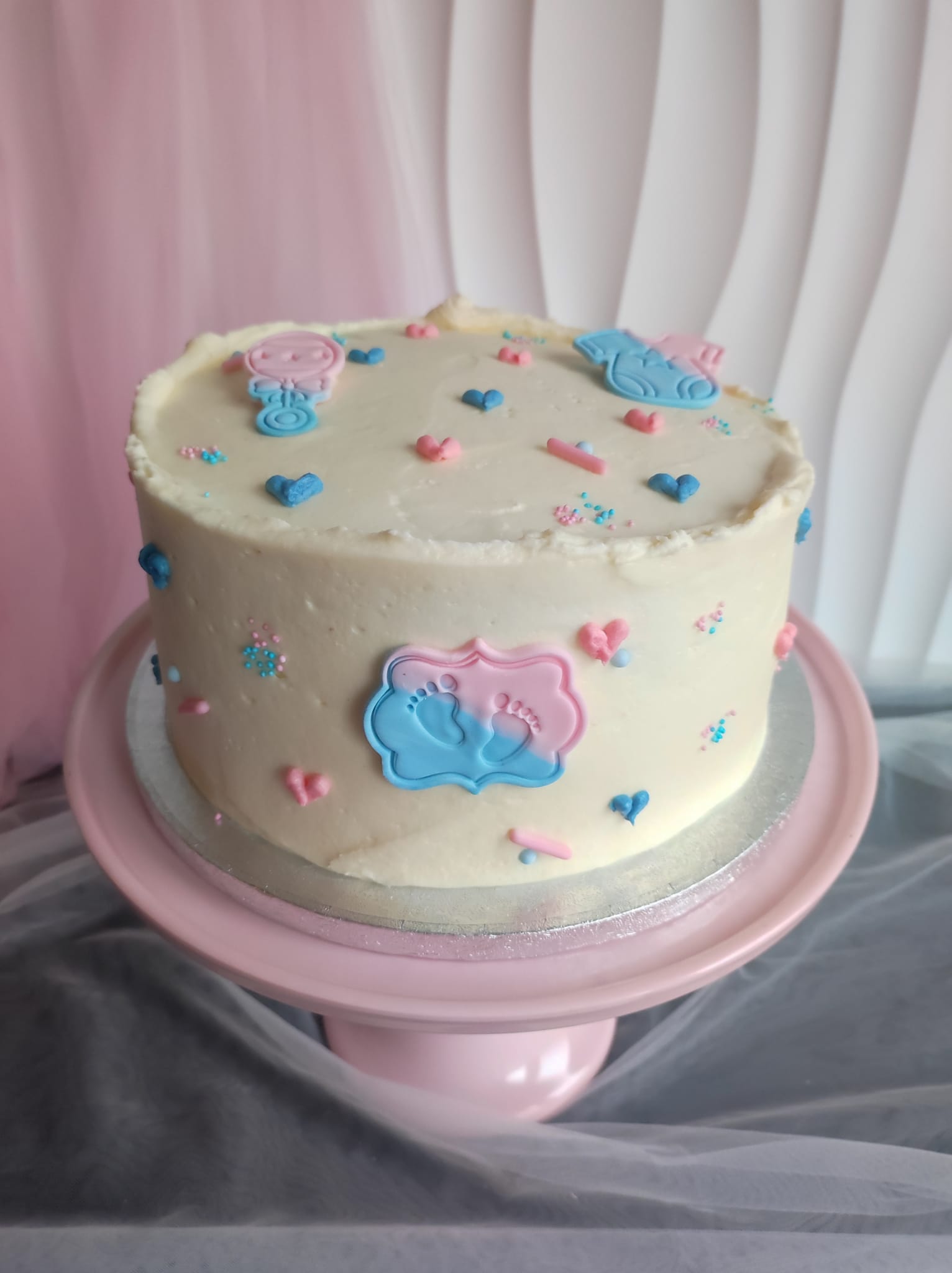 Twee lagen luchtige vanillecake, gevuld en afgewerkt met romige vanille buttercream. Versierd met buttercream swirls en gekleurde sprinkles. Inclusief naam- en cijferkoekje.
